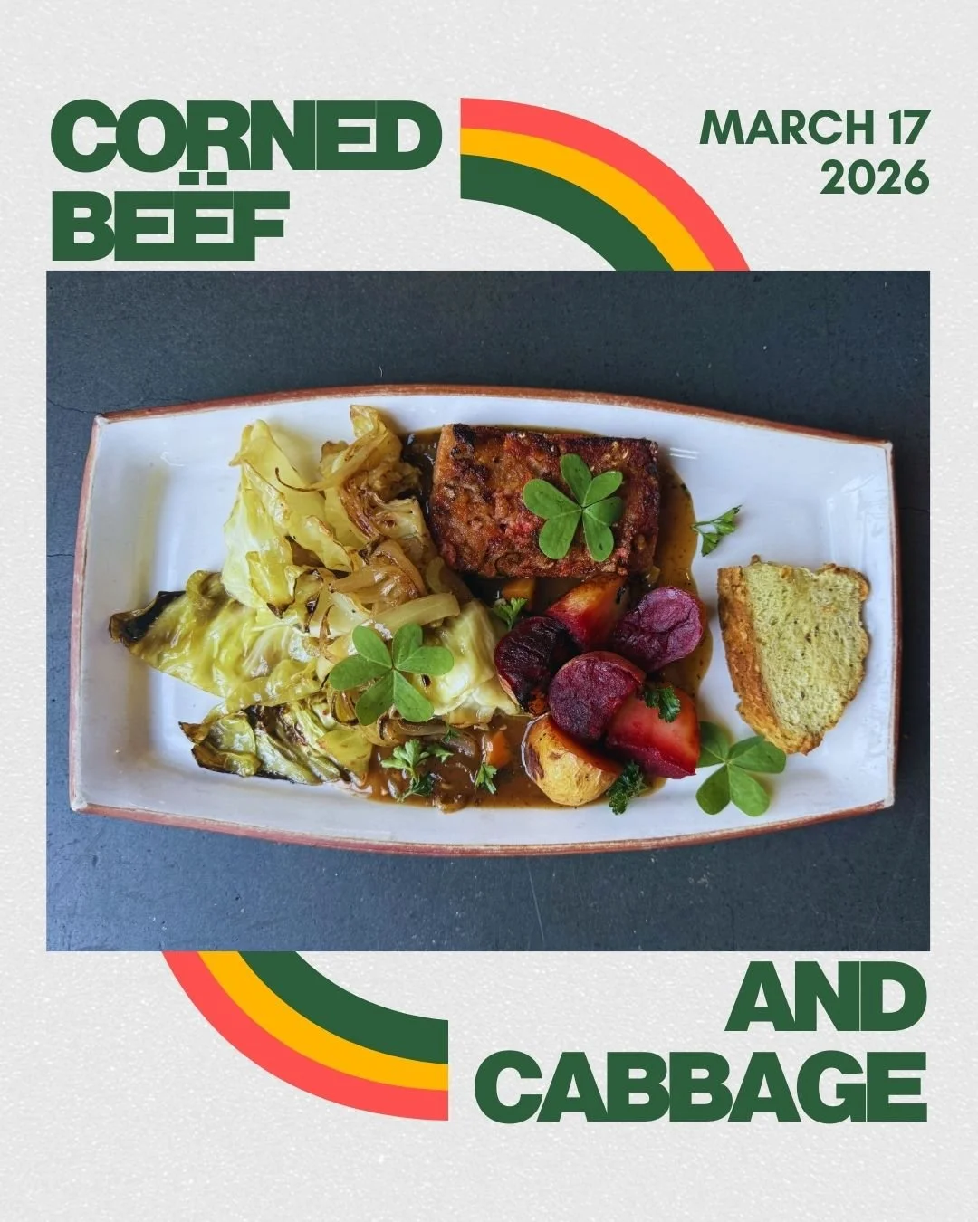 Irish soda bread, our house corned “beef” roast made with tofu & barley, beet-brined potatoes, braised cabbage and rich Guinness gravy tying it all together.