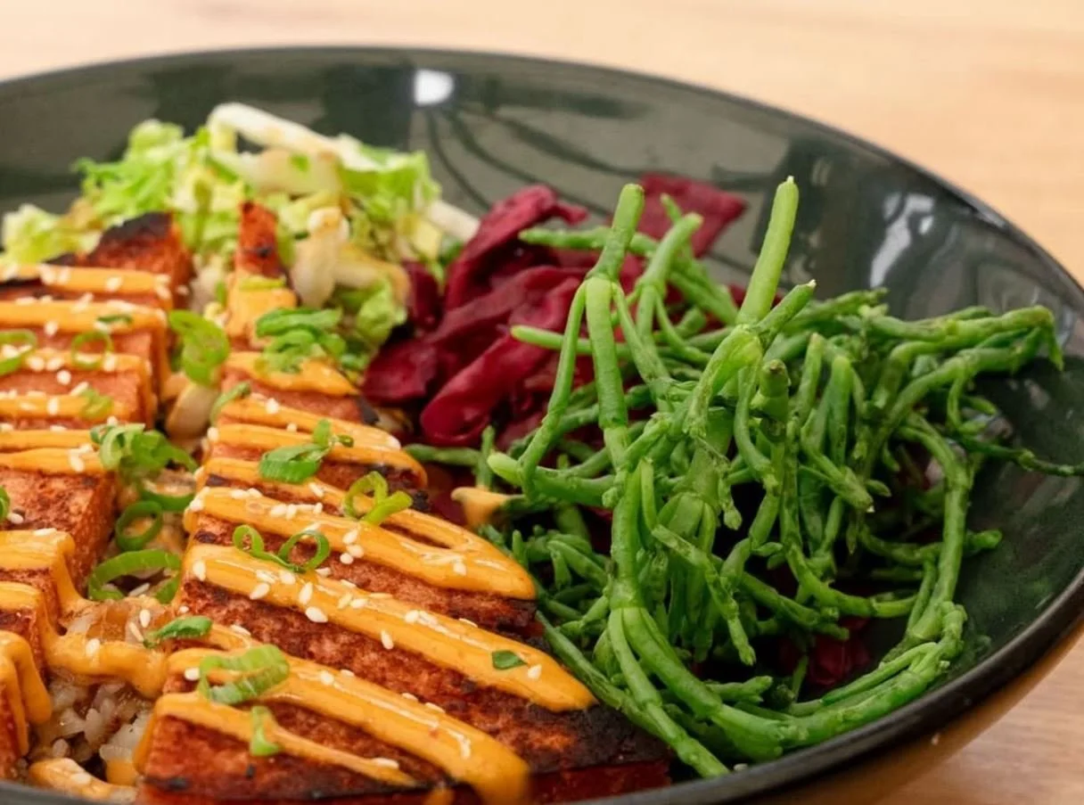 currently craving SPÄM & KIMCHI!! 🔥 — aka, bowl of our dreams, with our savory red lentil späm, crispy rice, kimchi, yum yum sauce, napa cabbage, sea beans and the perfect pinch of sesame. available in O’side and Costa Mesa, and waiting for you to dig in!